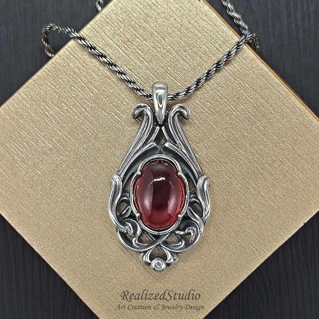 秘典霧語 | 新藝術風格經典藤飾浮雕復古吊墜 - 石榴石.S925銀