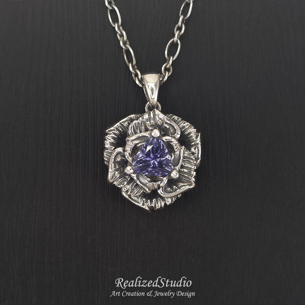 以玫瑰為主題設計的純銀吊墜,花瓣個別刻劃出紋理,分層製作,並染黑拋光做出視覺的立體層次。中心選用了一顆寶石等級的堇青石,其乾淨的晶體和完美的三角切工,呈現了飽滿的色澤和光彩,在不同角度可能呈現藍色到紫色的表現。