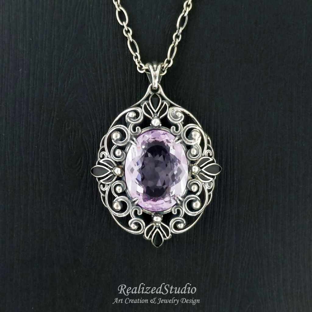 以鏤空渦捲紋裝飾的純銀墜子,主體的紫水晶來自玻利維亞,呈現優美的淺紫丁香色。